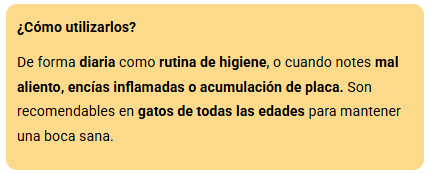 De forma constante, como rutina de higiene, o cuando notes placa, encías rojas o mal aliento. Son adecuados para gatos de cualquier edad.