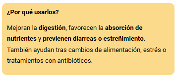 Favorecen la digestión, mejoran la absorción de nutrientes y ayudan a prevenir diarreas o estreñimiento. También resultan útiles tras un cambio de dieta, periodos de estrés o tratamientos veterinarios con antibióticos.