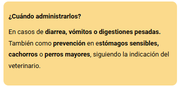 En casos de malestar digestivo evidente como diarreas, vómitos o digestiones pesadas. También como apoyo preventivo en cachorros, perros mayores o animales con estómagos sensibles, siempre siguiendo la recomendación de un profesional.
