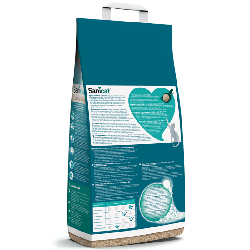 Sanicat Easy & Go es la solución ideal para quienes desean una arena aglomerante práctica, eficiente contra los olores y en un formato cómodo y económico.