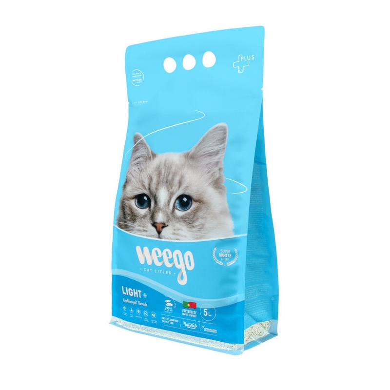 Weego Light+ es una arena aglomerante ligera hecha de bentonita natural, sin polvo y completamente segura. Destaca por su gran absorción, excelente control de olores y su manejo más cómodo gracias a su peso reducido.