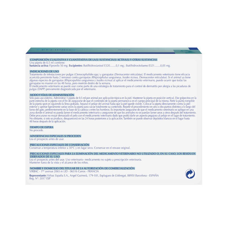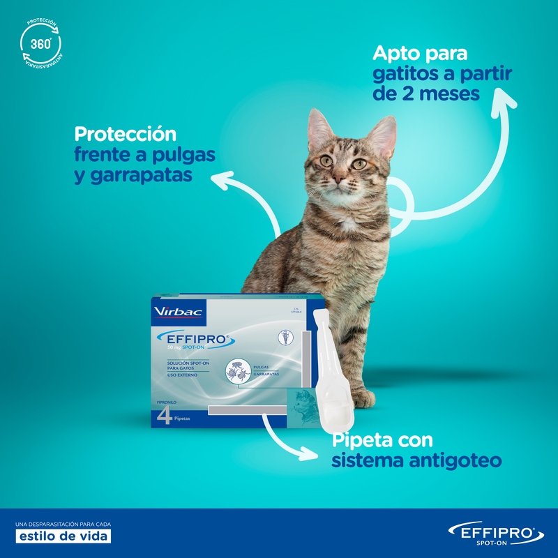 Descubre las eficaces pipetas Effipro diseñadas exclusivamente para gatos, un formidable antiparasitario externo creado para tratar y prevenir la presencia de pulgas y garrapatas. Con el potente Fipronilo como ingrediente activo, estas pipetas exhiben una eficacia insecticida y acaricida destacada, desestabilizando el sistema nervioso central de ácaros e insectos y llevándolos a su término.