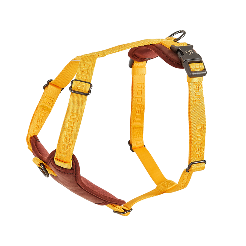 El arnés Freedog Linum Yellow Sunrise combina comodidad, protección y diseño sostenible gracias a sus materiales reciclados, siendo ideal para el uso diario en perros de cualquier tamaño.