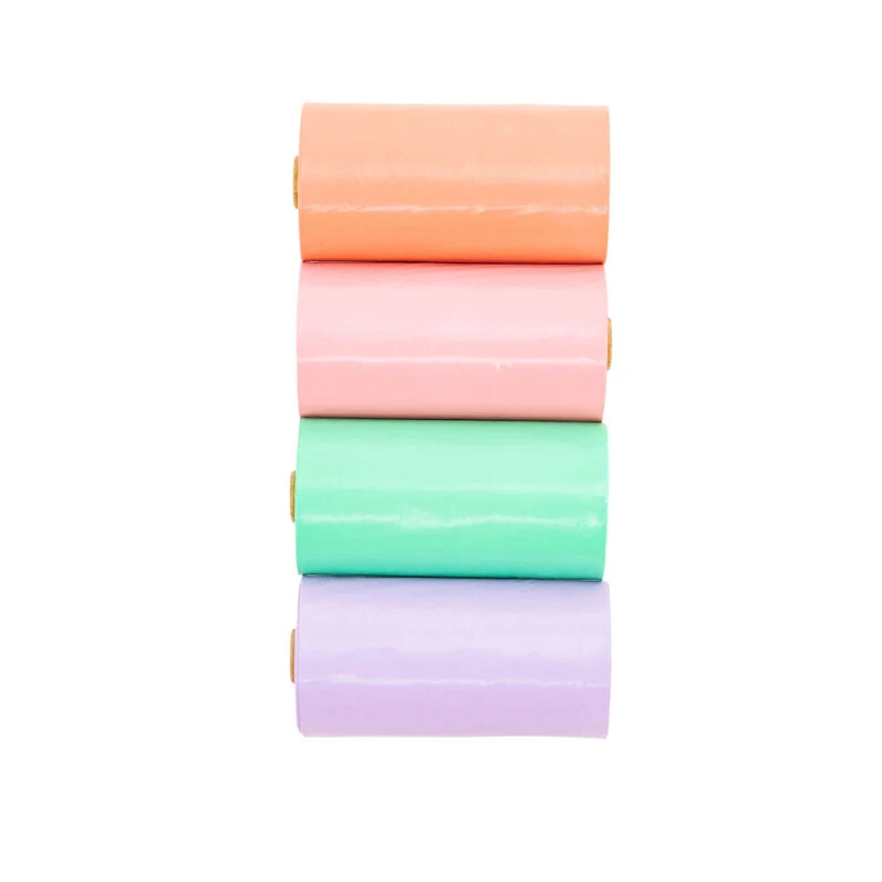 Pack con 4 rollos de 15 bolsas en colores pasteles. Resistentes, ligeras y sostenibles.