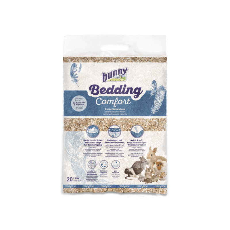 Lecho natural para relajamiento. Bunny Bedding Comfort es el lecho ideal para que sus mascotas se sientan lo más cómodas posible. La superficie maravillosamente suave les invita a relajarse de forma inmediata. Gracias a su textura natural, estimula el comportamiento natural de los animales manteniéndolos ocupados excavando y escarbando. La combinación ideal es con el Bunny Bedding Absorber (para poner debajo proporcionando una excelente capacidad de absorción). Esta combinación soñada ofrece a las mascotas y sus dueños el ambiente interior ideal y el lecho más seco durante semanas.