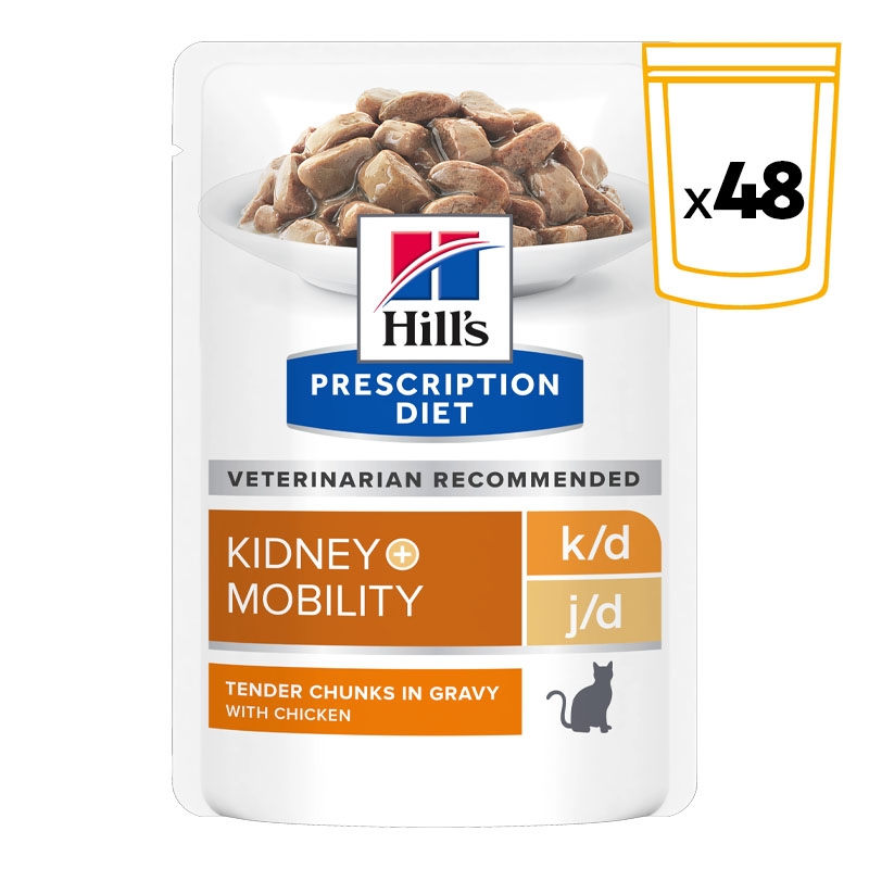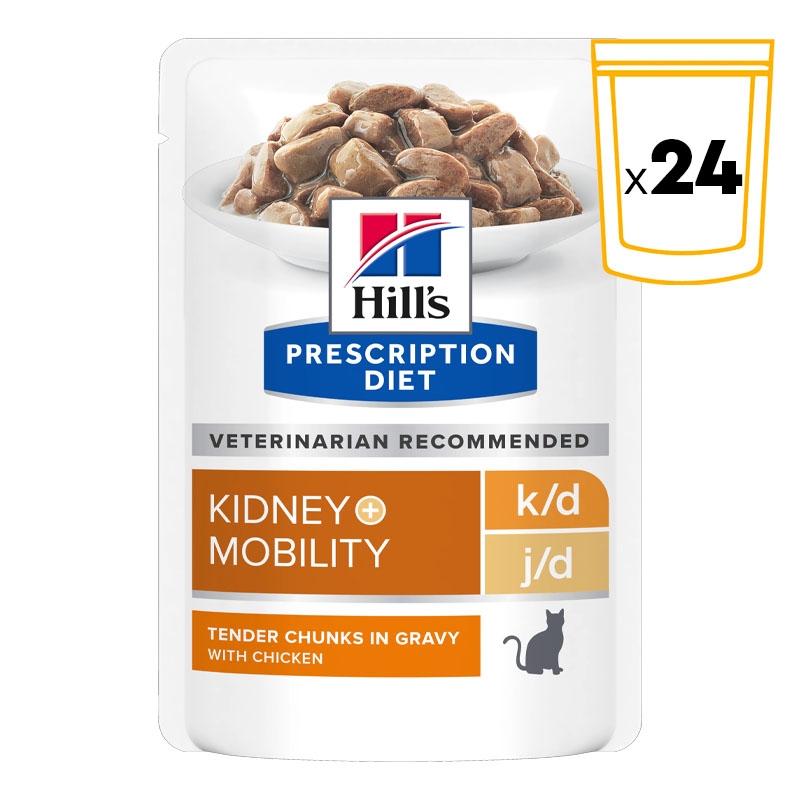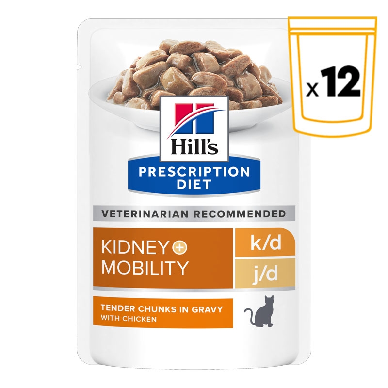 Hill's Prescription Diet k/d + Mobility sabor pollo proporciona una solución integral para problemas renales y de movilidad en gatos.