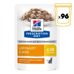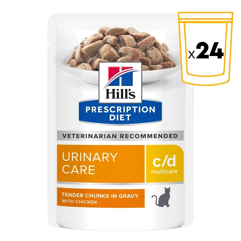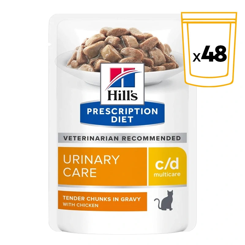 Hill's PRESCRIPTION DIET c/d Multicare en sobres con pollo es un alimento completo y específicamente formulado para tratar problemas urinarios en gatos adultos, incluyendo cálculos de estruvita y oxalato.