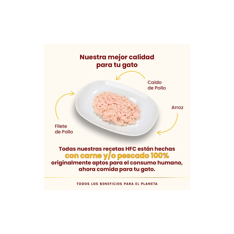 Receta HFC con filete de pollo y su propio caldo de grado humano, baja en grasa, sin aditivos y monoproteica. Diseñada para gatos esterilizados que necesitan controlar su peso y mantenerse hidratados.