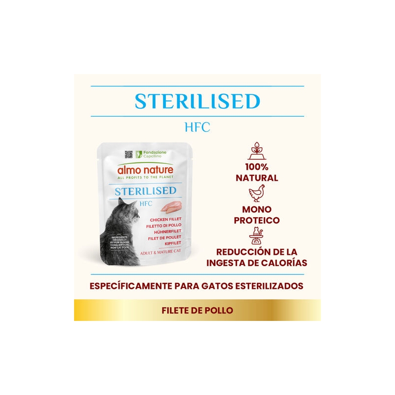 Alimento húmedo para gatos esterilizados en caldo de pollo HFC, monoproteico, bajo en grasa y sin aditivos; promueve la hidratación y contribuye al control del peso.