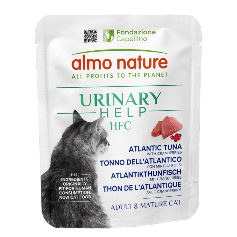 Alimento húmedo para gatos en caldo HFC con atún del Atlántico y arándanos rojos, sin aditivos y de alta humedad, que mejora la hidratación y apoya la salud urinaria.