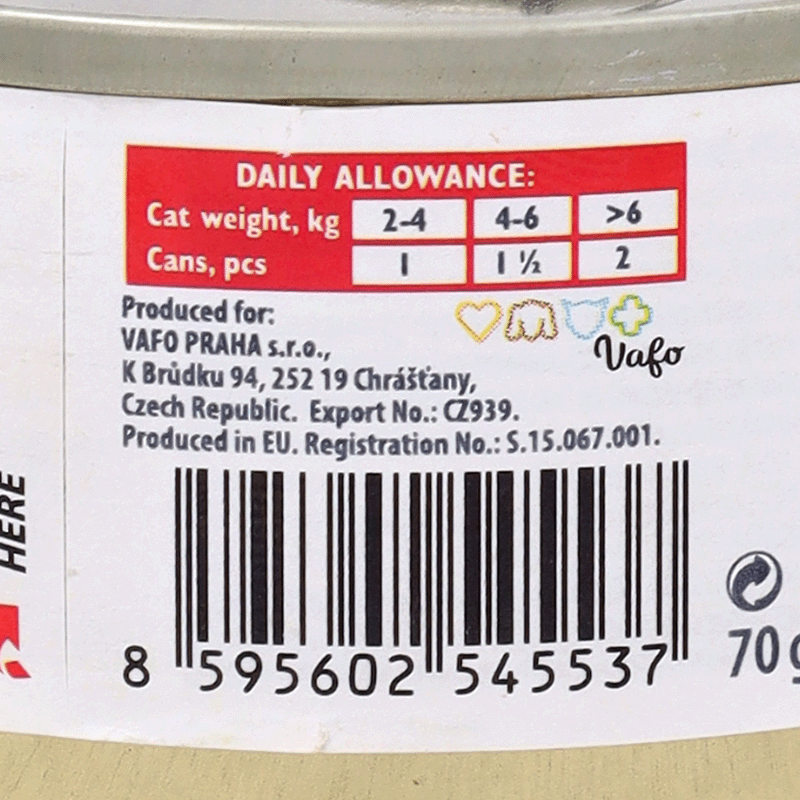 Componentes analíticos: Proteína cruda 8,8 %, grasa cruda 1,0 %, fibra cruda 0,8 %, ceniza cruda 0,9 %, humedad 88,0 %, calcio 0,01 %, fósforo 0,14 %. Con antioxidantes.