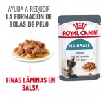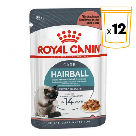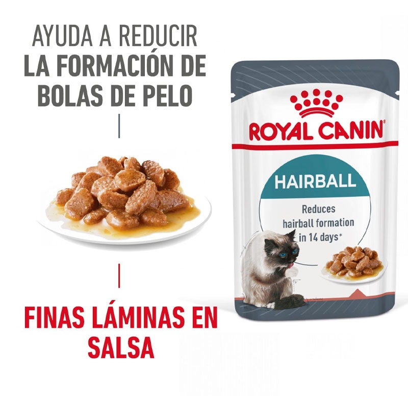 Hairball Care en salsa de ROYAL CANIN® ha sido desarrollado específicamente para abordar el problema de las bolas de pelo en gatos. Los gatos, al acicalarse, pueden ingerir pelo que luego se acumula en su sistema digestivo, resultando en molestas bolas de pelo. Esta fórmula ayuda de manera natural a estimular el tránsito intestinal, facilitando la eliminación del exceso de pelo ingerido y previniendo su acumulación en el estómago. Además, contribuye al mantenimiento del peso ideal gracias a su bajo contenido de grasa (tan solo 2.7%) y proporciona energía mediante ácidos grasos esenciales.
