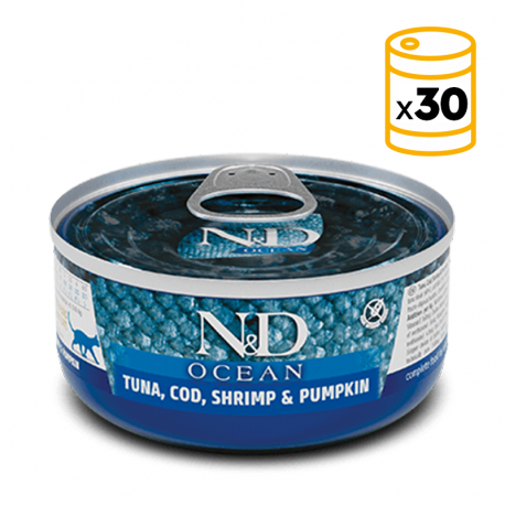 Descubre N&D Ocean Feline, una opción completa y nutritiva diseñada específicamente para gatos adultos. Con una exquisita mezcla de atún, bacalao, y calabaza, esta comida húmeda brinda una experiencia culinaria excepcional para tu felino en crecimiento.
