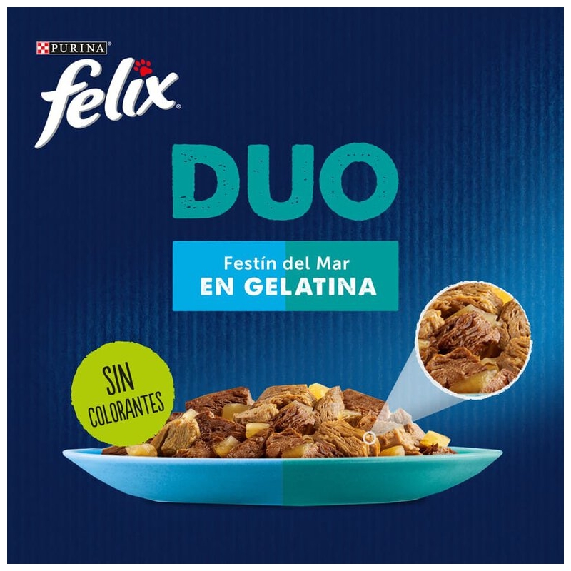 Ingredientes de Alta Calidad: Hecho con ingredientes seleccionados, cada receta de Felix Duo asegura frescura y calidad. Sin aromatizantes ni conservantes artificiales, puedes confiar en que estás proporcionando un alimento natural y seguro para tu felino.