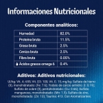 Con Carbonero y Salmón: Carnes y subproductos animales* (12%), Extractos de proteínas vegetales, Pescados y subproductos de pescado (carbonero 2%, salmón 2%), Sustancias minerales, Azúcares. *trocitos: 40% Carnes y suproductos animales.