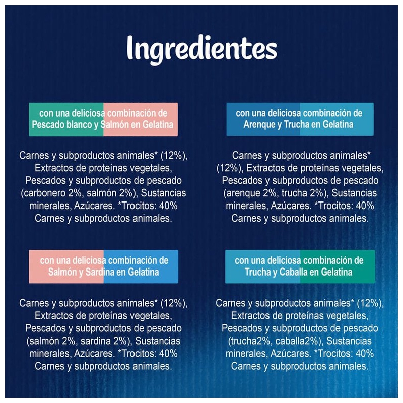 Con Trucha y Caballa: Carnes y subproductos animales* (12%), Extractos de proteínas vegetales, Pescados y subproductos de pescado (trucha2%, caballa2%), Sustancias minerales, Azúcares. *trocitos: 40% Carnes y subproductos animales.