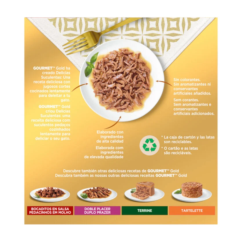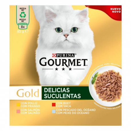 El multipack Gourmet Gold Delicias Suculentas es una excelente elección para quienes buscan ofrecer a sus gatos una comida húmeda de alta calidad y variedad, manteniéndolos contentos y saludables en cada comida.