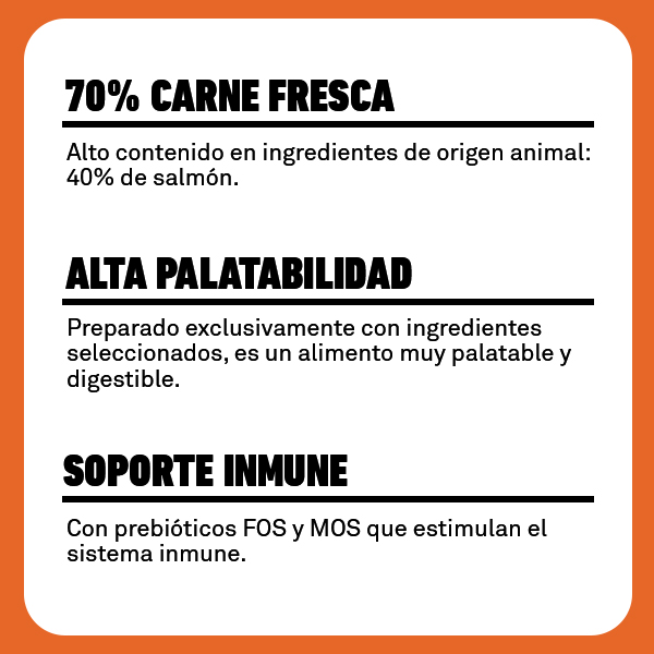Composición:Salmón 40%, pollo 30%, arroz 4%, proteína hidrolizada de pescado, minerales, xilosa, FOS, MOS.