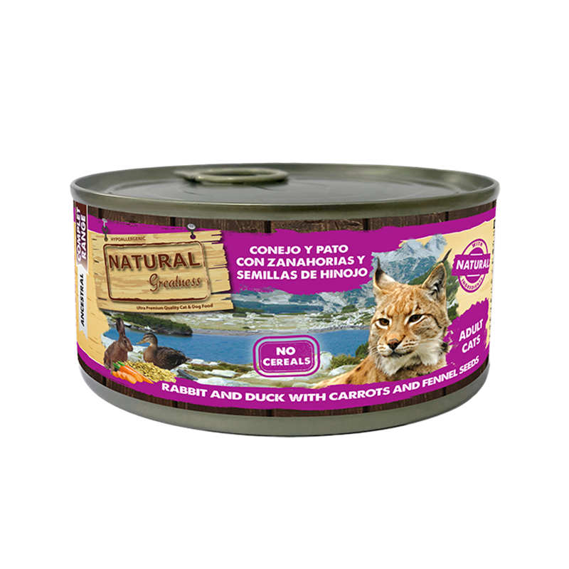 Con Natural Greatness Conejo y Pato, tu gato recibe un alimento húmedo nutritivo, sabroso y de máxima calidad.