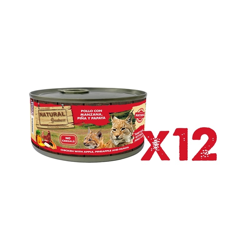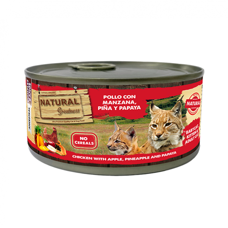 Natural Greatness Gatos con pollo, manzana, piña y papaya es una comida húmeda completa que combina proteínas de calidad con frutas digestivas, perfecta para gatos de todas las edades que buscan salud y sabor.