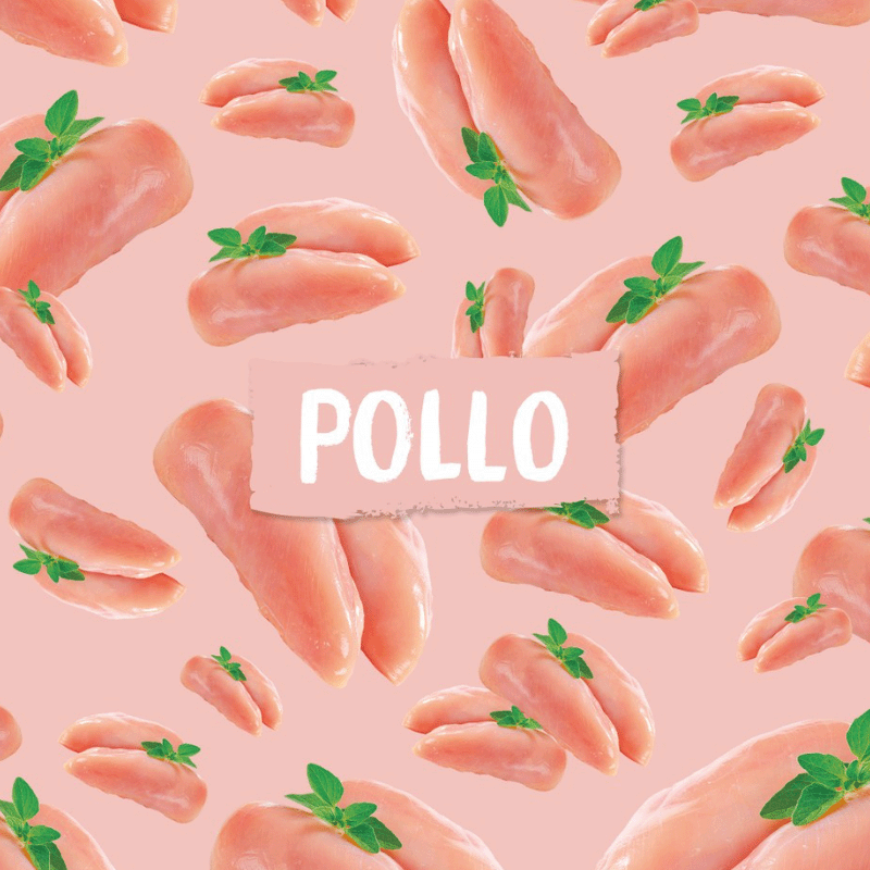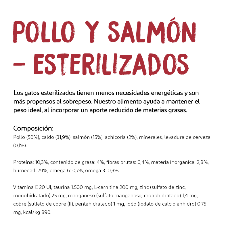 Composición: Pollo (50%), caldo (31,9%), salmón (15%), achicoria (2%), minerales, levadura de cerveza (0,1%).