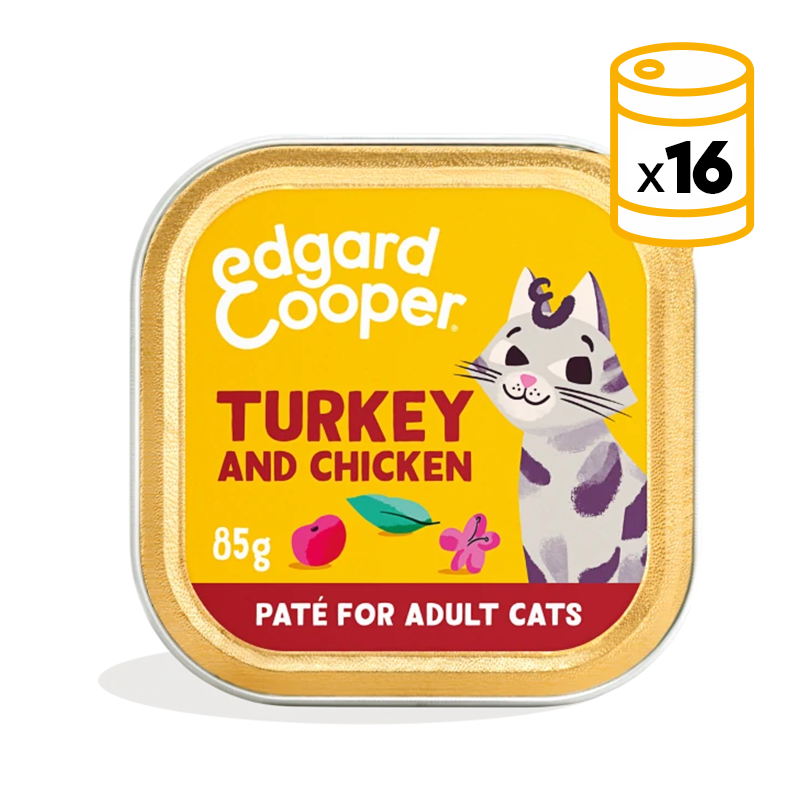 Descubre la exquisitez de nuestro paté de pavo y pollo para gatos adultos, elaborado con ingredientes naturales y 0% de azúcares añadidos.