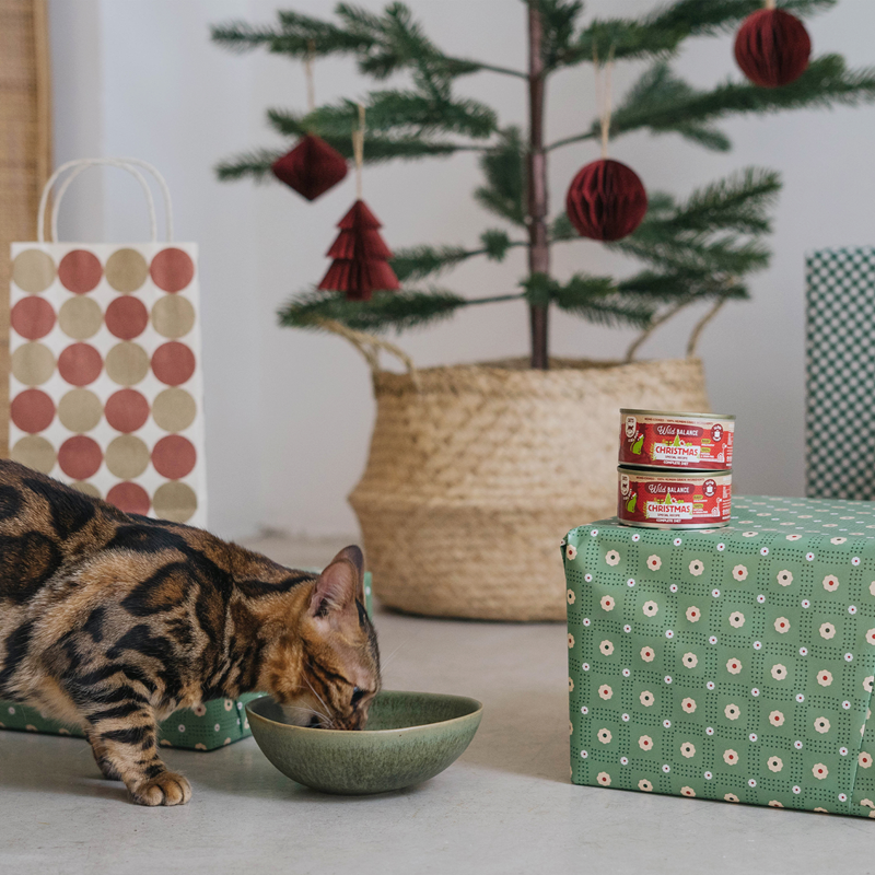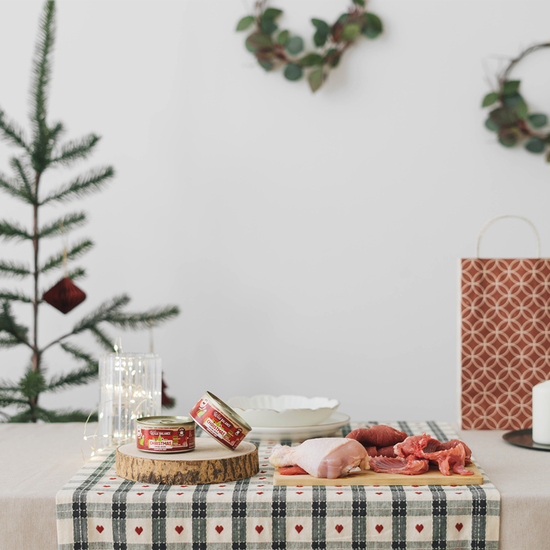 Comida húmeda natural con pavo y pescado para gatos, rica en proteínas y Omega 3 y 6 para un pelaje brillante y digestión equilibrada. Receta sin cereales ni aditivos, edición especial de Navidad.