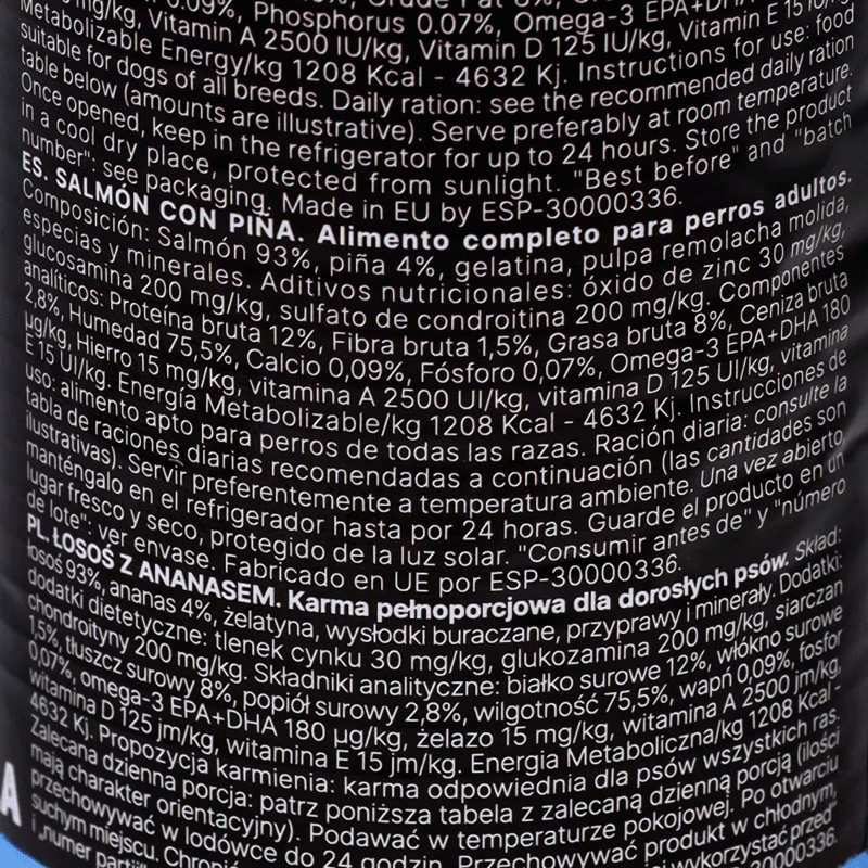 Salmón 93%, piña 4%, gelatina, pulpa remolacha molida, especias y minerales.