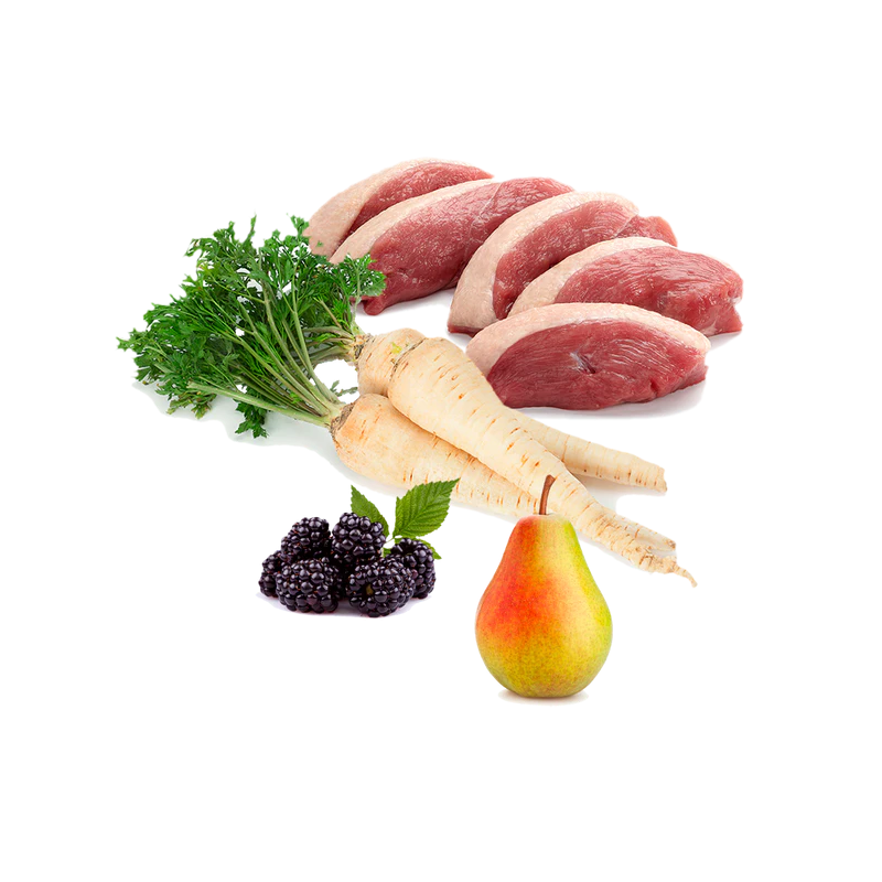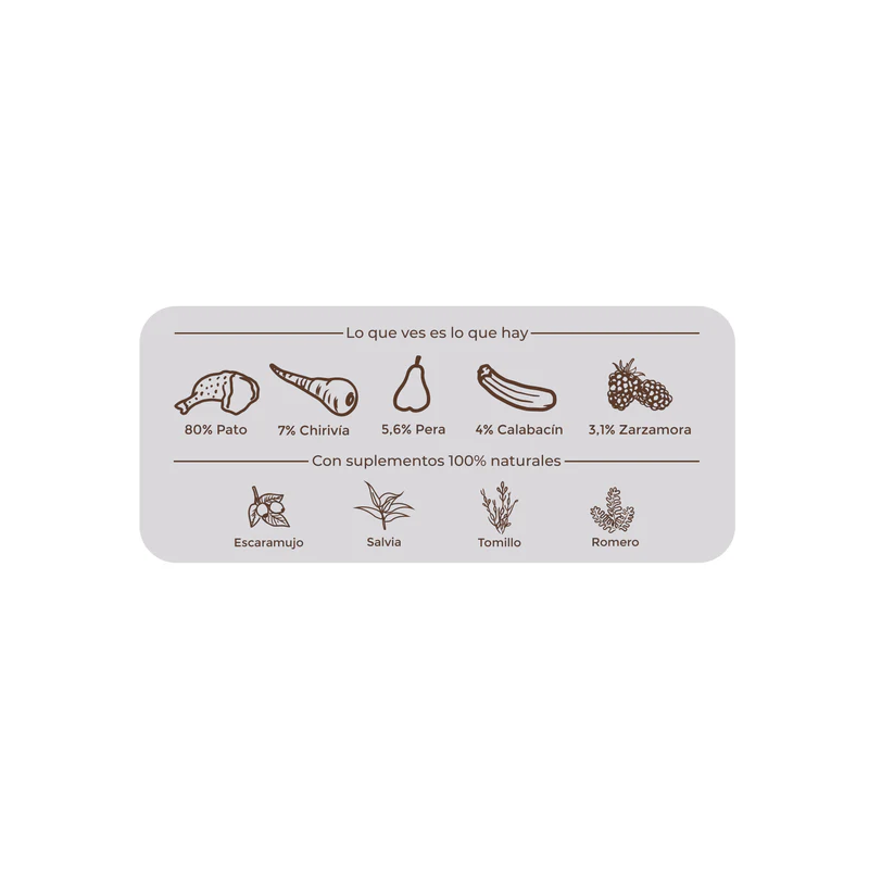 Composición: Pechuga de pato (52,5%), caldo de pato (10%), hígado de pato (7%)*, cuellos y carcasa de pato (7%)*, corazón de pato (3,5%)*, chirivía (7%)*, pera (5,6%)*, calabacín (4%)*, zarzamora (3,1%)*, escaramujo*, salvia*, tomillo*, romero*