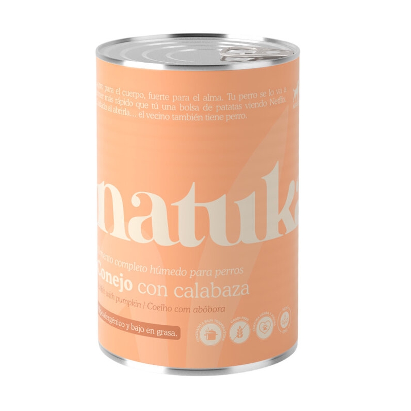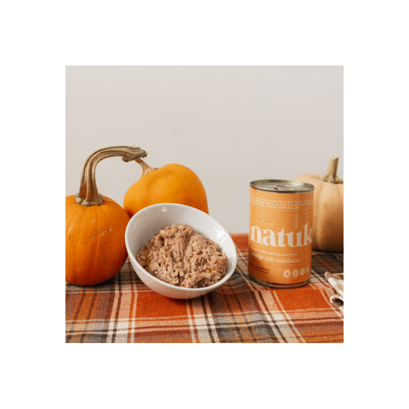 Natuka Conejo y Calabaza es una comida húmeda completa, sabrosa y fácil de digerir, pensada para perros con sensibilidades o que necesitan una dieta más ligera. Combina conejo fresco con calabaza natural y verduras suaves, aportando nutrición de calidad con buena tolerancia.