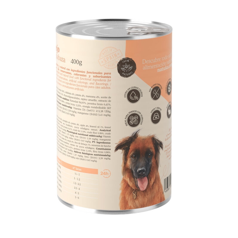 Composición: Carne de conejo (50%), calabaza (4%), patata (4%), manzana (4%), aceite de linaza (1%), semillas de hinojo (0,1%), sustancias minerales, fructooligosacáridos, espino amarillo y extracto de yucca schidigera.