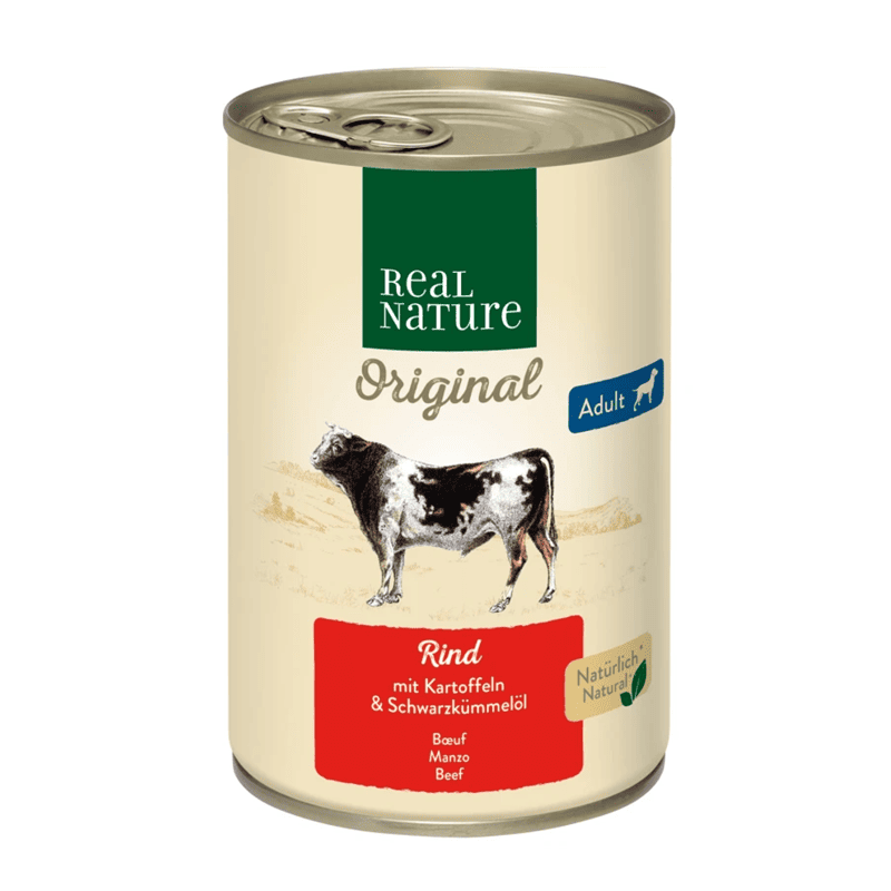 La receta de Ternera de Real Nature es perfecta para perros que disfrutan de la carne como fuente principal de proteína. Con un 68% de carne de vacuno (que incluye corazones, carne, hígado, pulmones y rumen), esta comida húmeda proporciona proteínas de alta calidad, esenciales para la salud muscular y general de tu perro. Acompañada de ingredientes como patatas y aceites naturales, esta receta asegura una digestión fácil y un sabor delicioso.
