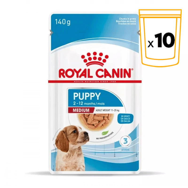 Presentamos el alimento completo Medium Puppy en salsa de ROYAL CANIN®, diseñado específicamente para cachorros de razas medianas durante su primer año de vida. Este producto ofrece un equilibrio nutricional óptimo para perros jóvenes con un peso adulto estimado entre 11 y 25 kg, garantizando un crecimiento saludable y una vida vibrante desde el principio.