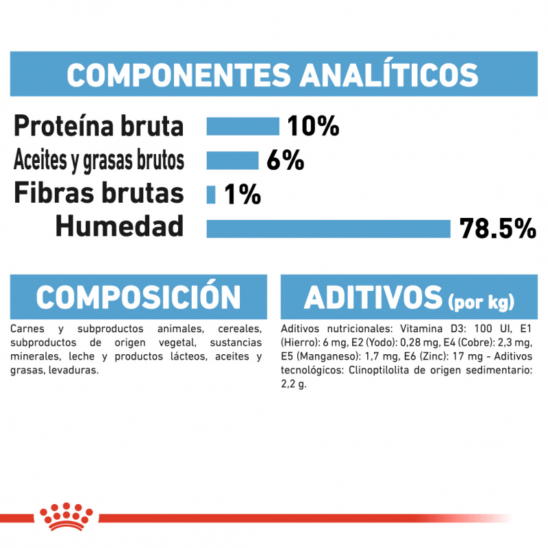 Componentes analíticos: Proteína bruta: 10,0% - Grasa bruta: 6,0% - Ceniza bruta: 1,9% - Fibra bruta: 1,0% - Humedad: 78,5%. .