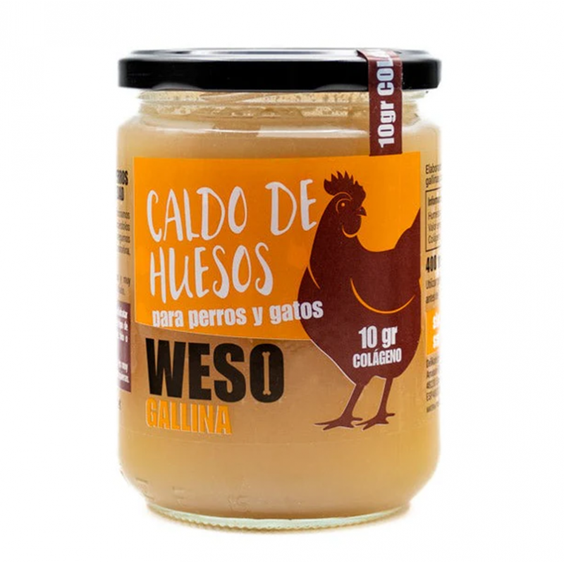 Weso Caldo de Huesos de Gallina es un complemento natural preparado con huesos de gallinas camperas cocidos lentamente durante más de 20 horas. Este proceso artesanal conserva colágeno, glucosamina, condroitina y aminoácidos que apoyan la digestión, articulaciones y sistema inmunitario de perros y gatos.