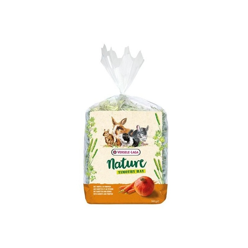 Versele Laga Nature Timothy Hay con Zanahoria y Calabaza es un heno enriquecido con zanahoria y calabaza, diseñado para roedores y pequeños mamíferos, que promueve la digestión, el desgaste dental y la salud inmunitaria.