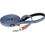 El azul con bandas reflectantes aporta un diseño moderno y, al mismo tiempo, mejora la visibilidad en zonas con poca luz, siendo muy útil para paseos nocturnos o al amanecer. Se ofrece en dos longitudes (5 m y 10 m) y cuenta con el Sello 1% Para Los Animales, apoyando la protección animal.