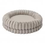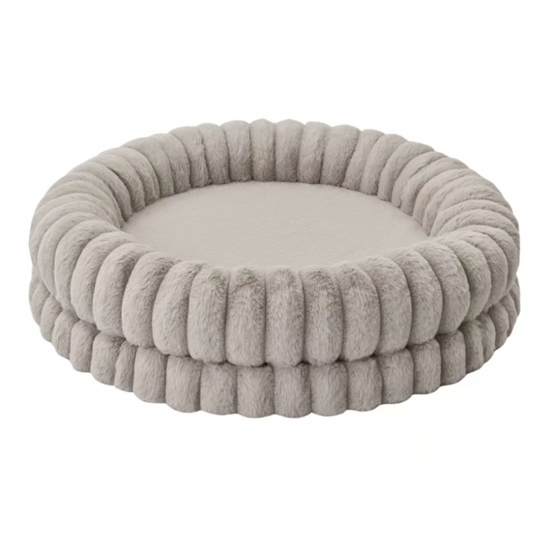 Cama redonda tipo cuna para perros y gatos en color gris, mullida y envolvente, con bordes elevados que aportan sensación de seguridad.