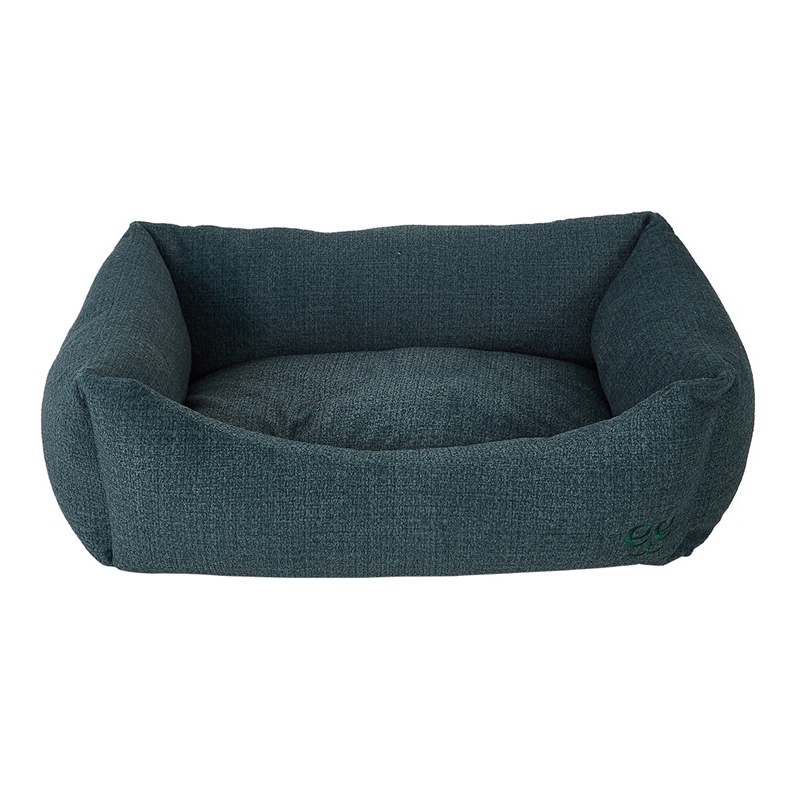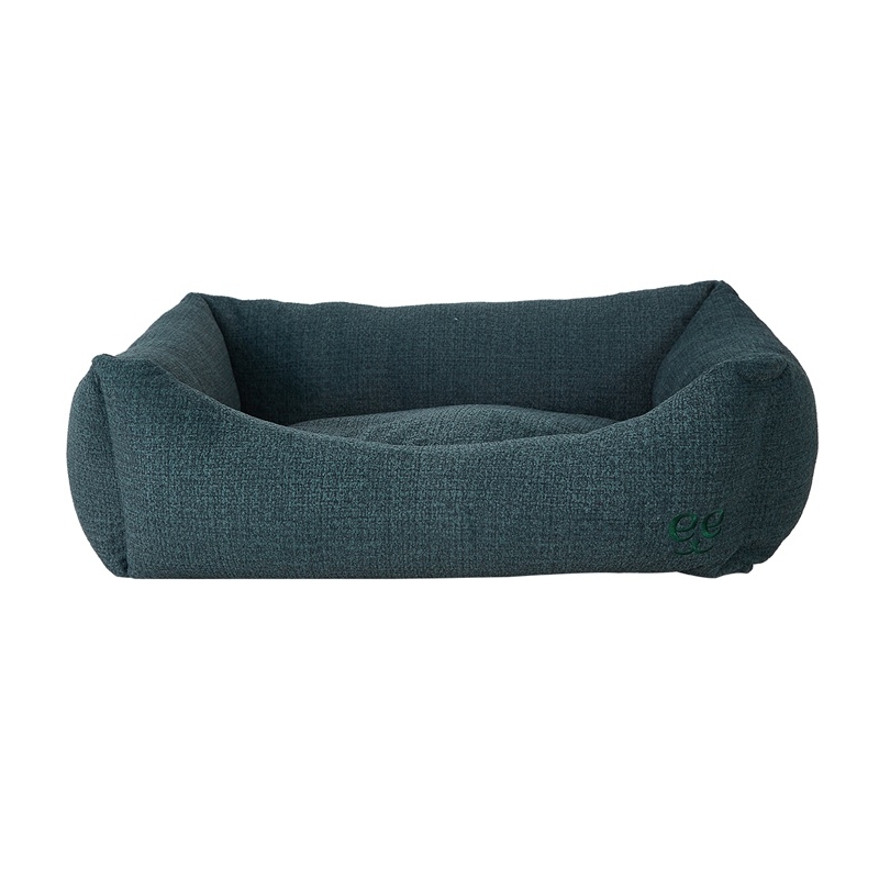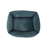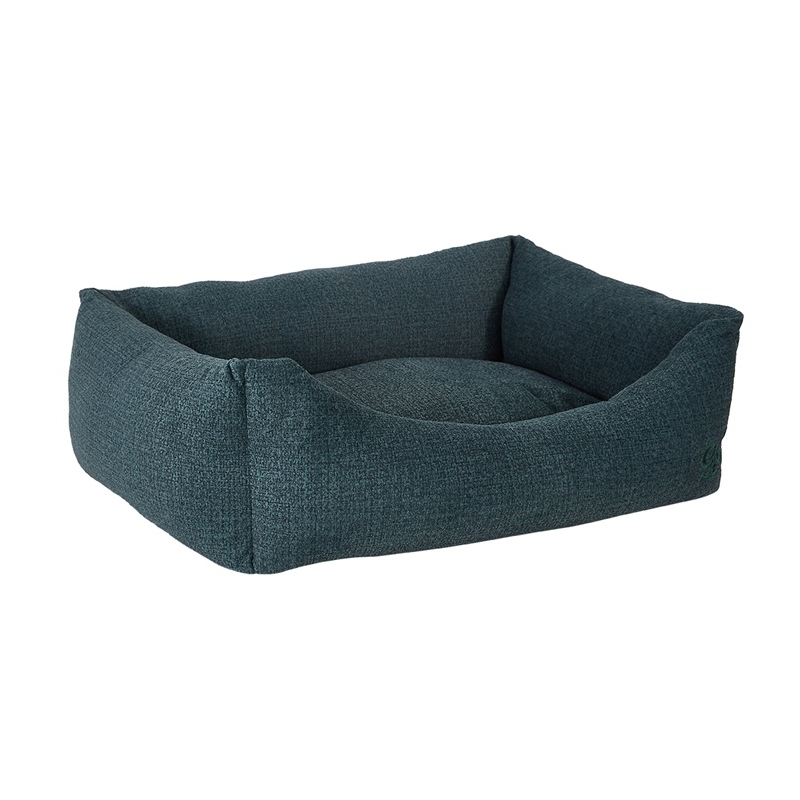 Cama tipo cuna para perros y gatos en verde, de diseño actual, con tejido tipo lino resistente y bordes elevados para un descanso cómodo.