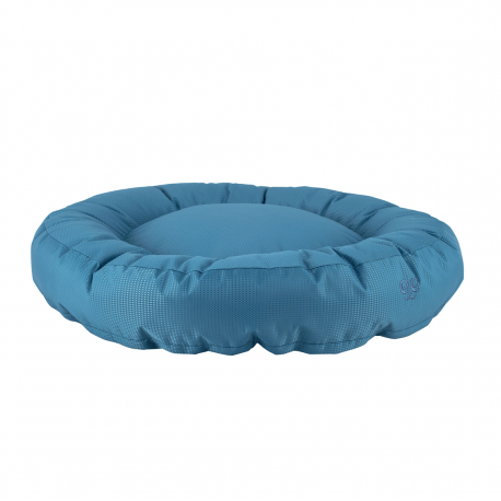 Cama donut para perros y gatos en azul, resistente y cómoda, con funda extraíble y base impermeable, ideal para uso diario.