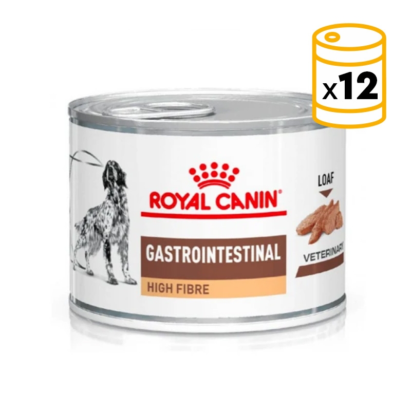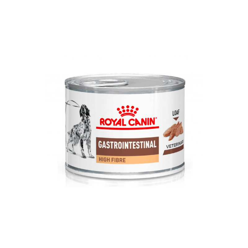 Royal Canin Gastrointestinal High Fibre es un alimento húmedo en formato paté, ideal para perros que necesitan regular su digestión y mejorar el tránsito intestinal. Su fórmula rica en fibra ayuda en casos de estreñimiento o digestiones difíciles.