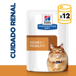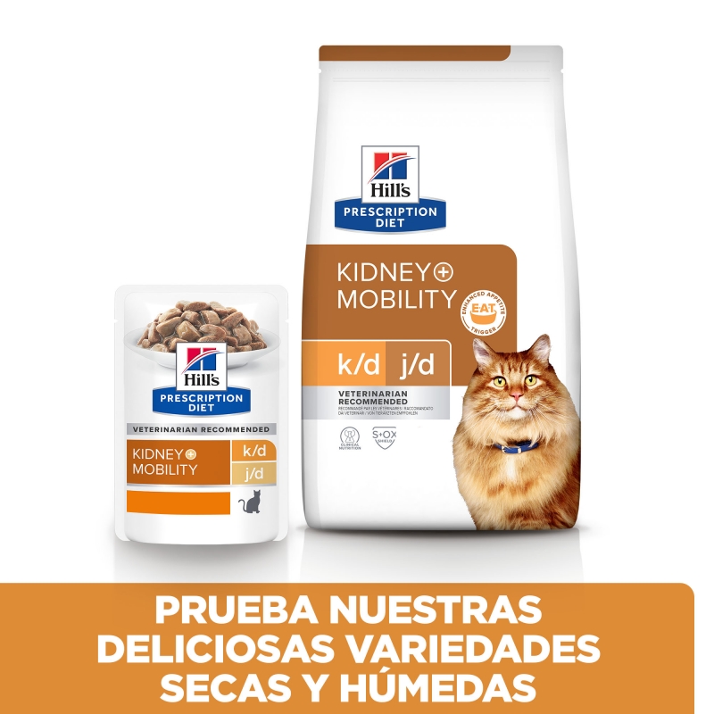 Hill's Prescription Diet k/d + Mobility sabor pollo proporciona una solución integral para problemas renales y de movilidad en gatos.