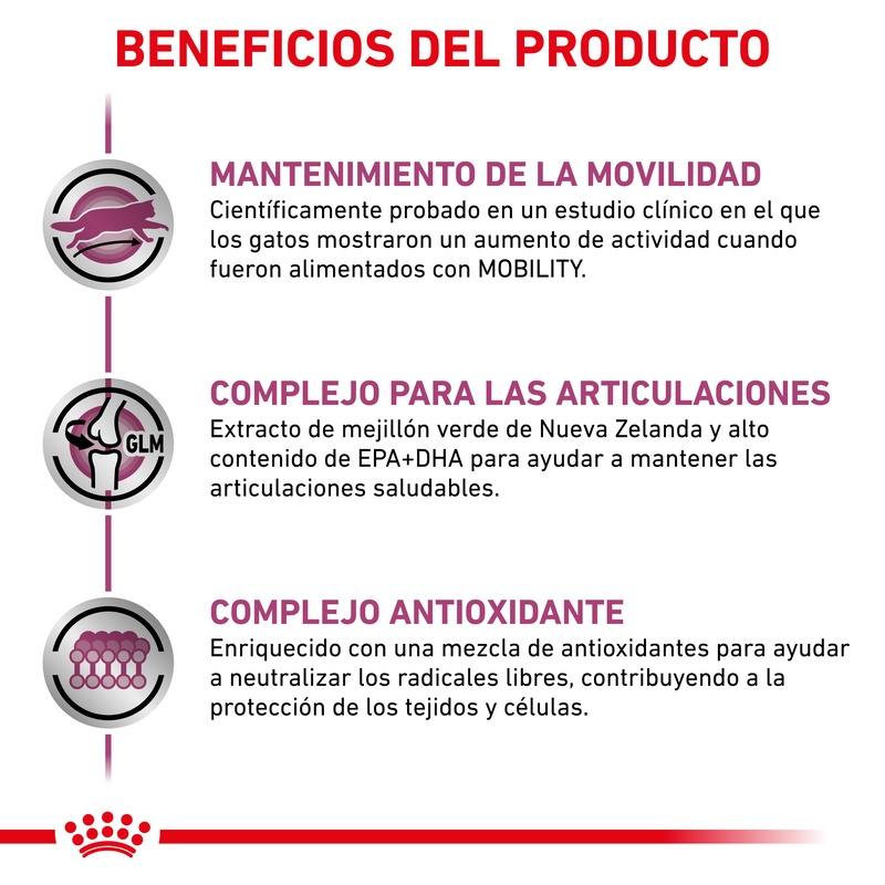 ROYAL CANIN® MOBILITY dry is a complete feed for cats formulated to support joint health. Recomendaciones: sigue las recomendaciones nutricionales de tu veterinario.