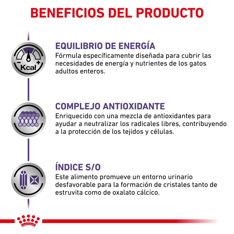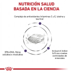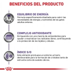 El pienso se adapta a las necesidades energéticas de los gatos y está enriquecido con un complejo de antioxidantes diseñados por Royal Canin que contribuye a neutralizar los radicales libres, causantes del envejecimiento.