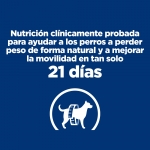 Los expertos en nutrición y veterinaria de Hill's han creado Prescription Diet Metabolic + Mobility, un alimento especializado para el control del peso y la salud de las articulaciones de tu perro. Este alimento trabaja en armonía con el gasto energético de tu mascota para lograr una pérdida de peso efectiva y sostenible. Además, ha demostrado clínicamente que mejora la movilidad en tan solo 21 días. Este alimento seco con delicioso sabor a pollo es la solución perfecta. Hill's Prescription Diet Metabolic + Mobility es un alimento completo diseñado para reducir el exceso de peso y favorecer la salud articular en perros adultos con osteoartritis. Su fórmula de baja densidad energética, rica en EPA y ácidos grasos omega-3, así como vitamina E adecuada, marca la diferencia.