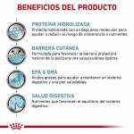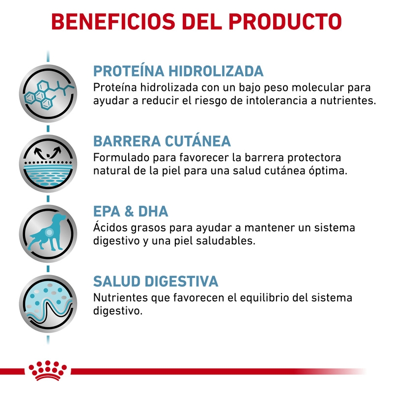 ROYAL CANIN® Hypoallergenic se ha desarrollado especialmente para asistir a perros adultos que padecen intolerancias, alergias alimentarias o problemas dermatológicos debido a sensibilidades. Esta fórmula utiliza proteínas hidrolizadas con péptidos de tamaño reducido para asegurar una dieta altamente digestible y con un bajo potencial alergénico, lo que promueve una mejor absorción de proteínas y minimiza el riesgo de reacciones alérgicas. Además, gracias a sus nutrientes de apoyo, esta fórmula refuerza la barrera natural de la piel de tu perro.