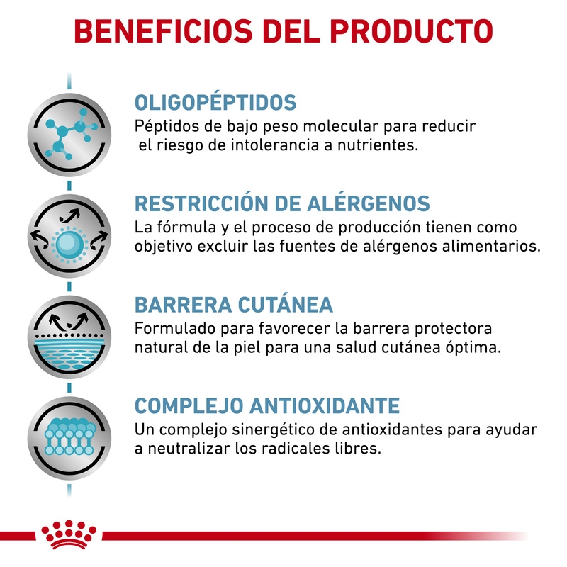 Además de su eficacia en la gestión de alergias alimentarias, esta fórmula está enriquecida con antioxidantes que combaten los efectos perjudiciales de los radicales libres en el cuerpo de tu mascota, contribuyendo así a mantener una piel saludable y un pelaje brillante. Es importante destacar que este alimento debe utilizarse únicamente bajo la recomendación y supervisión de un veterinario, y cualquier transición dietética debe ser gradual para garantizar la adaptación adecuada de tu perro.