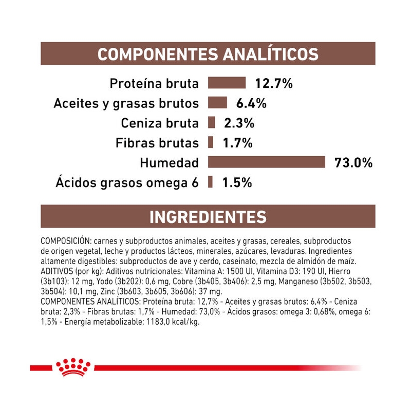 Componentes analíticos: Proteína bruta: 12,7% - Aceites y grasas brutos: 6,4% - Ceniza bruta: 2,3% - Fibras brutas: 1,7% - Humedad: 73,0% - Ácidos grasos: omega 3: 0,68%, omega 6: 1,5% - Energía metabolizable: 1183,0 kcal/kg.