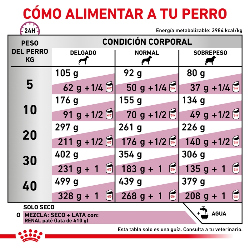 Es importante destacar que ROYAL CANIN® Renal debe ser administrado únicamente bajo la recomendación de un veterinario. Cuando realices la transición de la dieta de tu mascota, asegúrate de hacerlo gradualmente durante 7 a 10 días y proporcionar las porciones adecuadas, especialmente si combinas alimentos. Para atender las preferencias individuales de cada perro,
