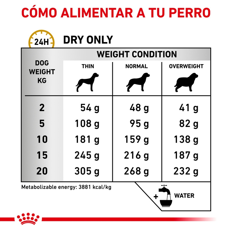 | Peso del perro (Kg) | Delgado | - | Normal | - | Sobrepeso | - |